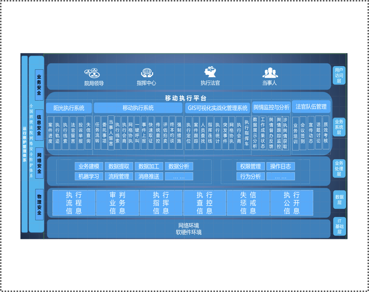 移動(dòng)執行平臺,以解決當事人信息不對稱(chēng)、服務(wù)法官外勤辦案、服務(wù)執行工作管理、強化執行輿情析、支持法官在線(xiàn)培訓五大需求為基礎,滿(mǎn)足全國移動(dòng)執行辦案數據的匯聚、管理、應用,建立依托于互聯(lián)網(wǎng)支撐的全國四級法院統一版本的移動(dòng)執行平臺,將全國執行辦案和執行管理系統從法院專(zhuān)網(wǎng)向互聯(lián)網(wǎng)端的橫向拓展和縱向深入,實(shí)現執行案件信息與執行公開(kāi)服務(wù)深度融合,為當事人參與執行和法官執行辦案提供全天候的標準化、智能化信息服務(wù)和保障。